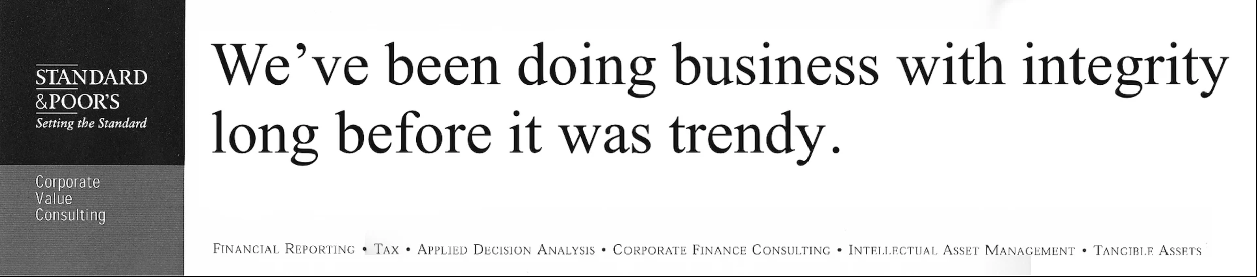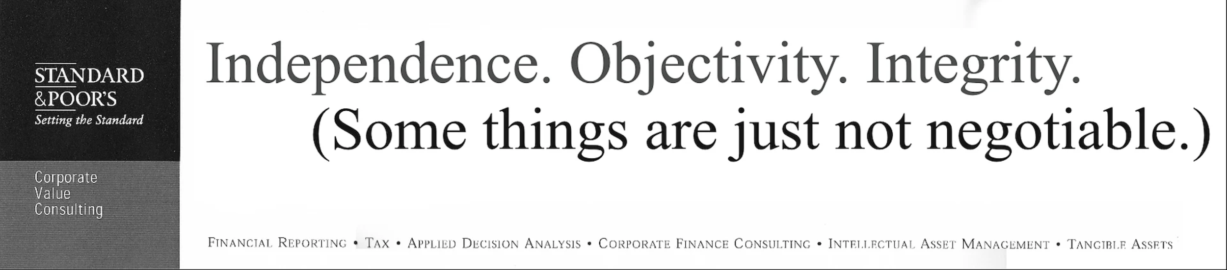 S&P prides itself on three principles: Independence, Objectivity and Integrity. Now, how to say it without sounding stodgy. Hmmm…